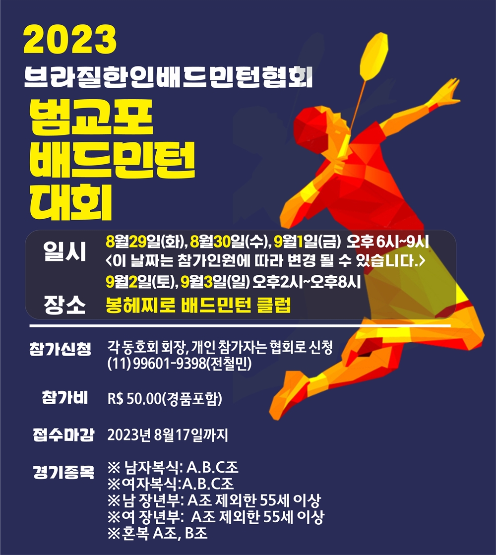 한편, 범 교포 배드민턴 대회는 남녀 복식, 남자 장년부, 여자 장년부, 혼합 복식 등 총 4개 종목으로 경기가 진행될 예정이다. 참가비는 50헤알로 정해져 있으며, 대회 참가를 희망하는 참가자들은 8월 17일까지 각 동호회를 통해 신청할 수 있다. 개인 참가자의 경우 브라질 한인 배드민턴 협회의 전화번호 99601-9398로 신청하면 된다.