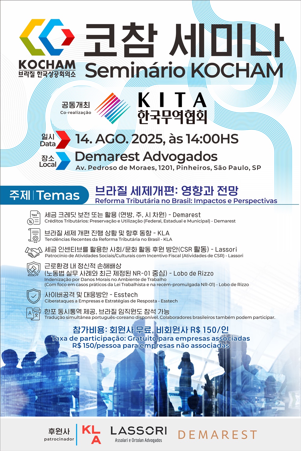 세미나는 한-포르투갈어 동시통역으로 진행되며, 코참 회원사는 무료, 비회원사는 150헤알의 참가비로 참석할 수 있다.