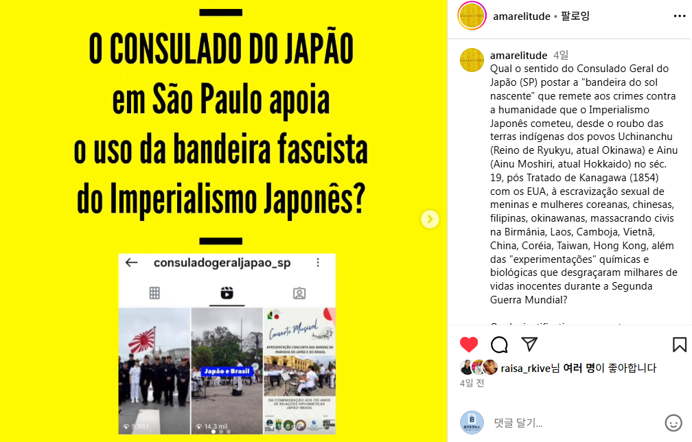 브라질 내 동아시아계 디아스포라의 정체성을 논하는 인스타그램 계정 ‘아마렐리튜드(amarelitude)’는 즉각 비판 성명을 냈다. 이들은 “욱일기는 일본 제국주의가 저지른 반인도적 범죄를 떠올리게 하는 상징물”이라며 “주상파울루 일본 총영사관이 한국, 중국, 필리핀, 대만, 오키나와 커뮤니티의 고통스러운 기억을 무시하려는 것인가”라고 강하게 규탄했다.