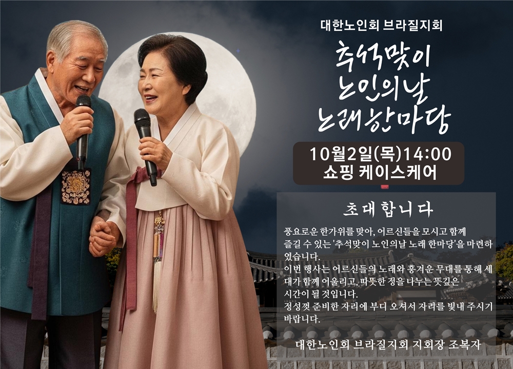 [좋은아침] 대한노인회 브라질지회(회장 조복자)가 주최하는 ‘추석맞이 노인의 날 노래 한마당’이 오는 10월 2일(목) 오후 2시, 한인타운 봉헤찌로에 위치한 쇼핑 K-Square 루프탑에서 열린다.