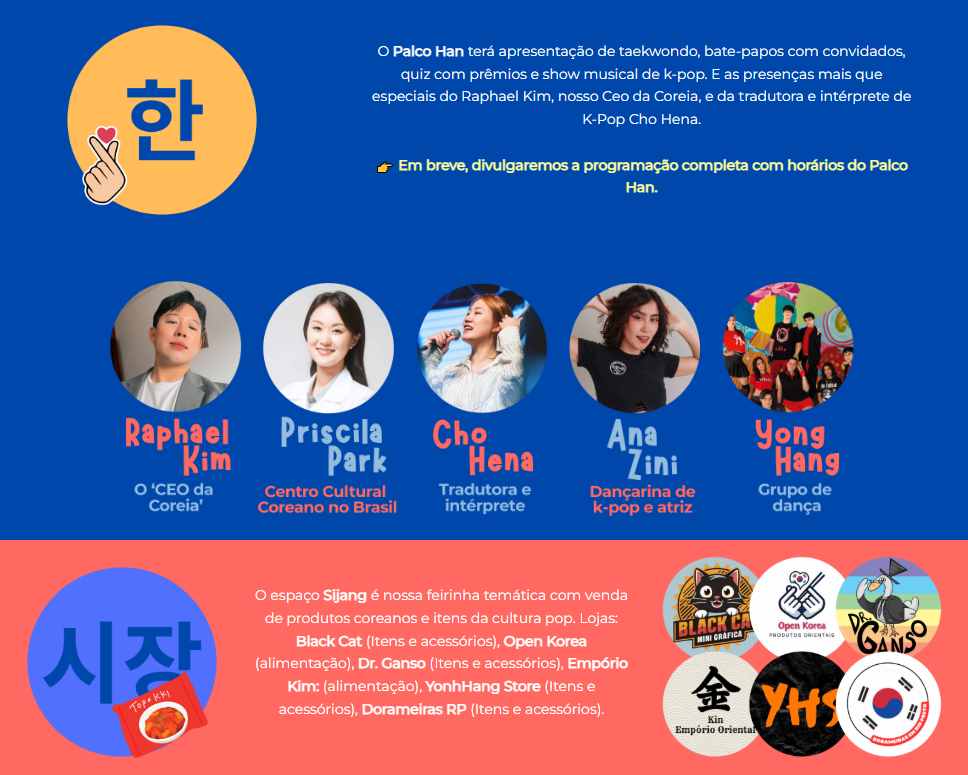 이번 축제의 하이라이트는 단연 스페셜 토크쇼이다. ‘CEO da Coreia’ 하파엘 김, K팝 전문 통역사 조혜나, 주브라질한국문화원 박소현 담당관이 한자리에 모여 K-컬처에 대한 생생한 이야기를 들려줄 예정이라 현지 팬들의 관심이 집중되고 있다. 또한, 화려한 K팝 댄스 커버와 박진감 넘치는 태권도 시범 공연이 펼쳐져 축제 분위기를 뜨겁게 달굴 것이다.
