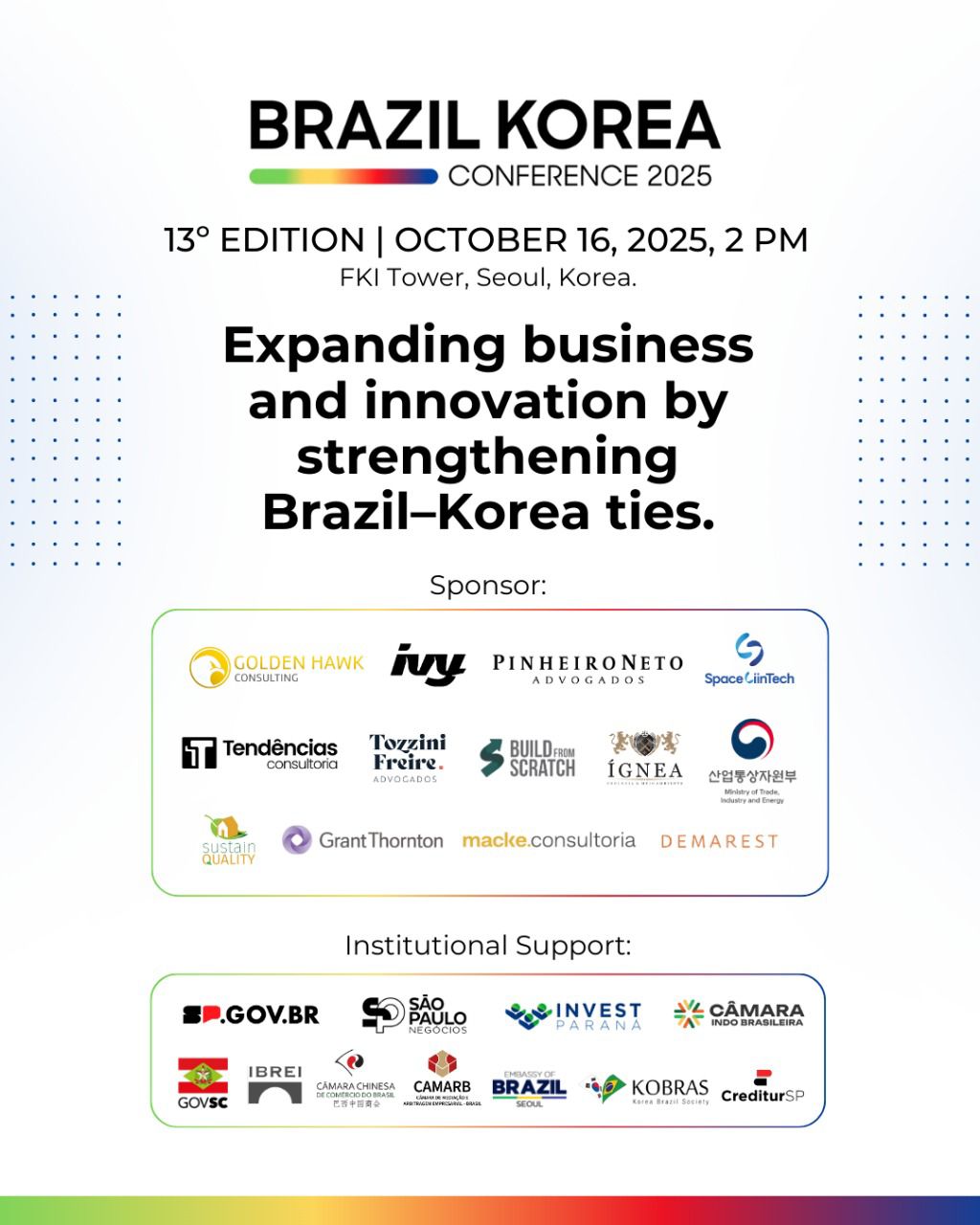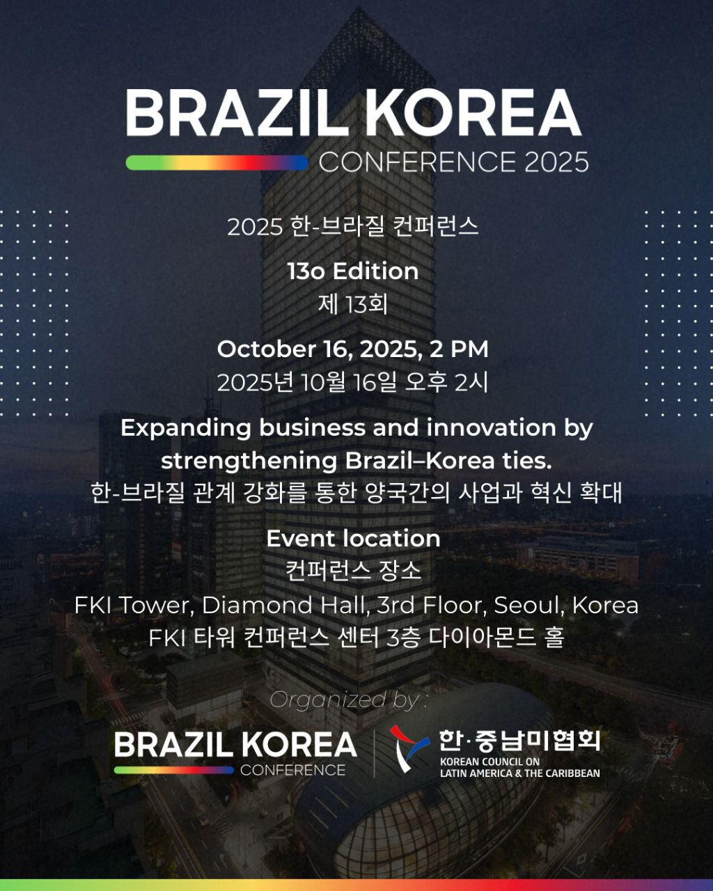 브라질-한국 컨퍼런스(BKC)와 한-중남미협회는 오는 10월 16일 오후 2시 서울 여의도 FKI타워 다이아몬드홀에서 ‘제13회 브라질.한국 컨퍼런스 2025’를 공동 개최한다.