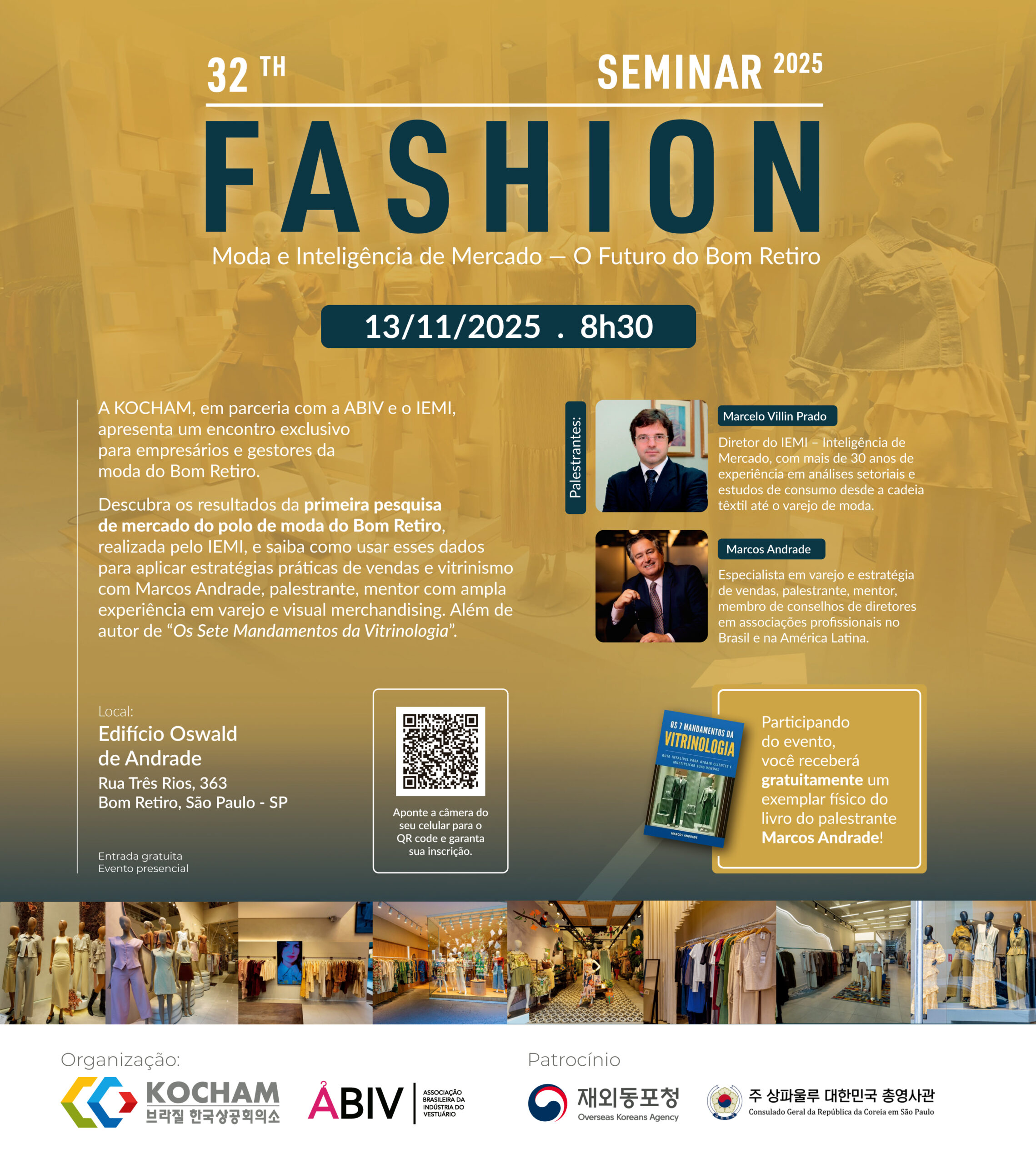 [좋은아침] 브라질 한국상공회의소(코참)는 오는 11월 13일(목) 오전 8시 30분, 한인타운 봉헤찌로에 위치한 오스왈두 지 안드라지 문화센터에서 제32회 패션세미나를 개최한다.