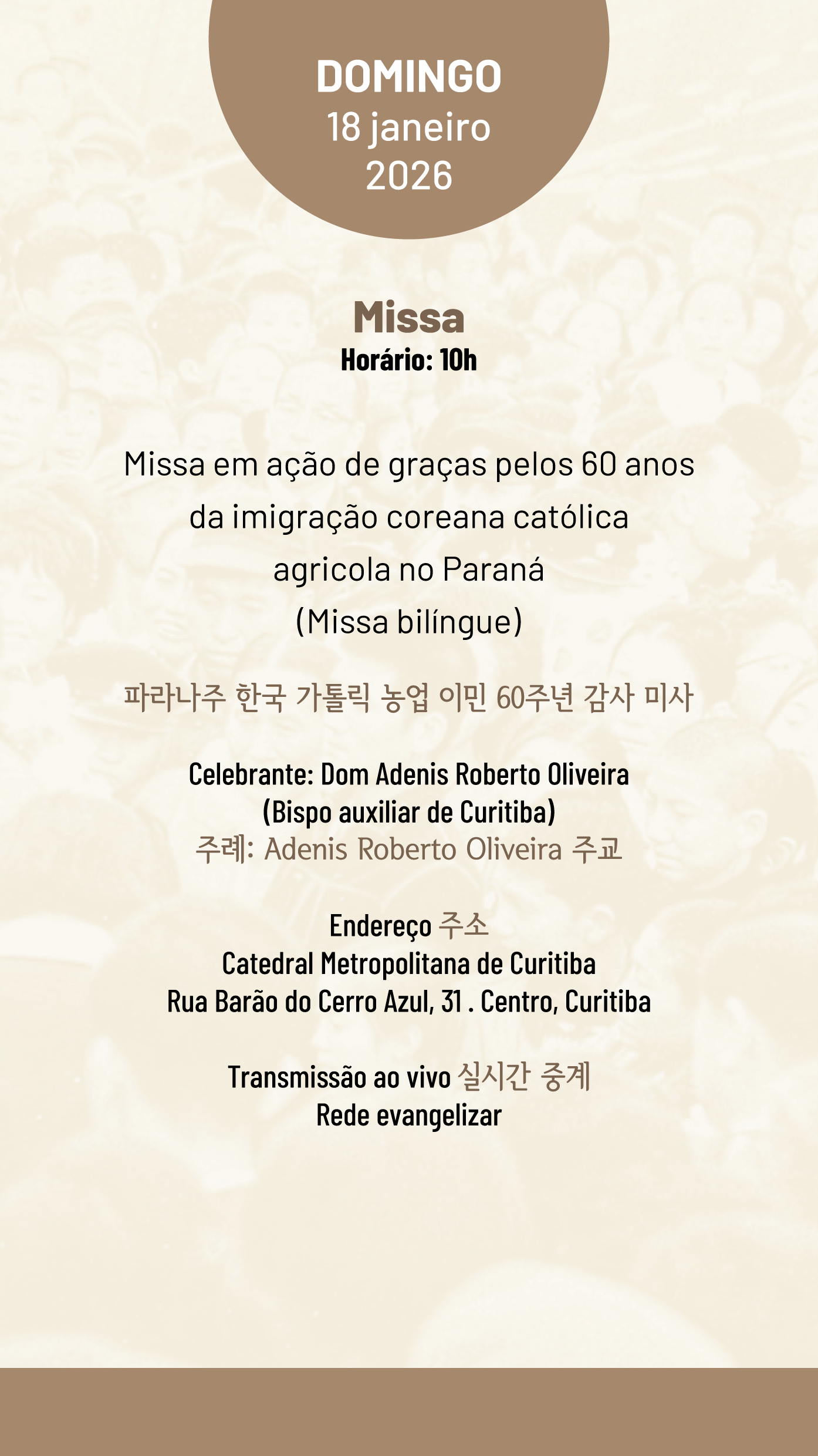 미사는 쿠리치바 대교구 아데니스 호베르토 올리베이라(Dom Adenis Roberto Oliveira) 주교가 집전하며, 한국어와 포르투갈어 2개 국어로 진행돼 현지 사회와 한인 공동체가 함께 어우러지는 자리가 될 전망이다. 이날 미사 실황은 가톨릭 방송인 ‘헤지 에반젤리자르(Rede Evangelizar)’를 통해 생중계된다.