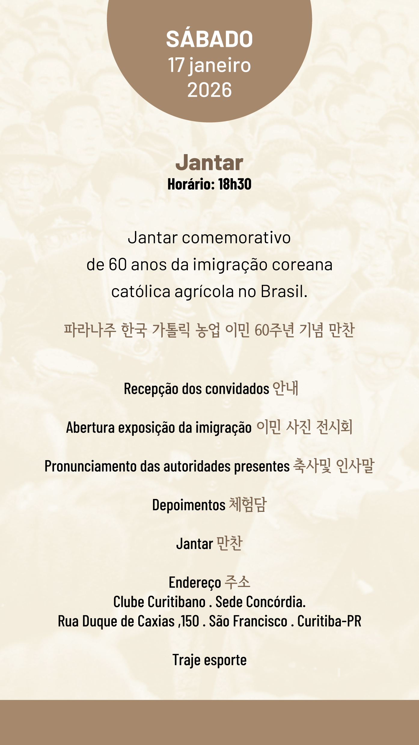 행사 첫날인 17일(토) 오후 6시 30분에는 쿠리치바 시내에 위치한 Clube Curitibano(Rua. Duque de Caxias, 150. São Francisco. Curitiba)에서 기념 만찬이 열린다. 이날 행사에는 이민 당시의 생생한 모습을 담은 사진 전시회 개막식과 함께 주요 내빈들의 축사가 이어진다. 특히 이민 1세대들이 직접 겪은 생생한 체험담을 공유하며 지난 60년의 역사를 회고하는 시간도 마련된다.