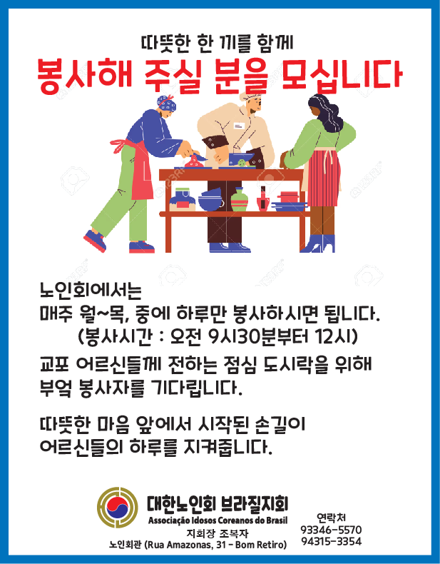봉사 참여 신청 및 자세한 문의는 대한노인회 브라질지회(☎ 93346-5570 / 94315-3354)로 하면 된다.