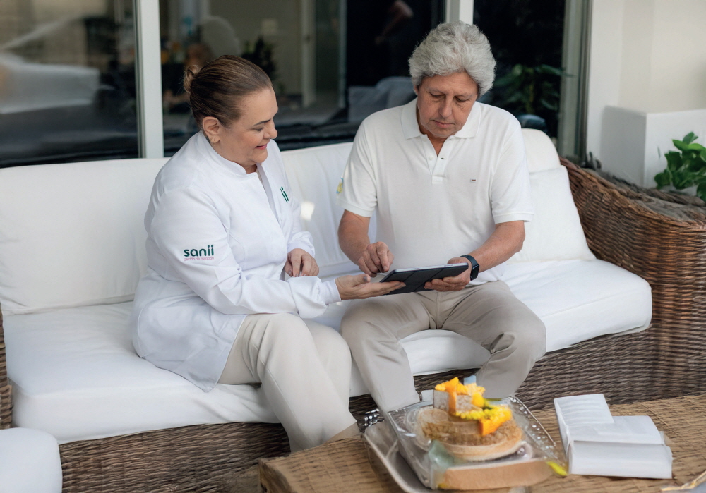 A Sanii disponibiliza ▲ Um Gerontólogo dedicado para cada família ▲ Suporte de enfermagem 24/7 ▲ Relatórios transparentes diários. Através do sistema, os familiares podem acompanhar o status do paciente em tempo real, garantindo tranquilidade mesmo à distância.