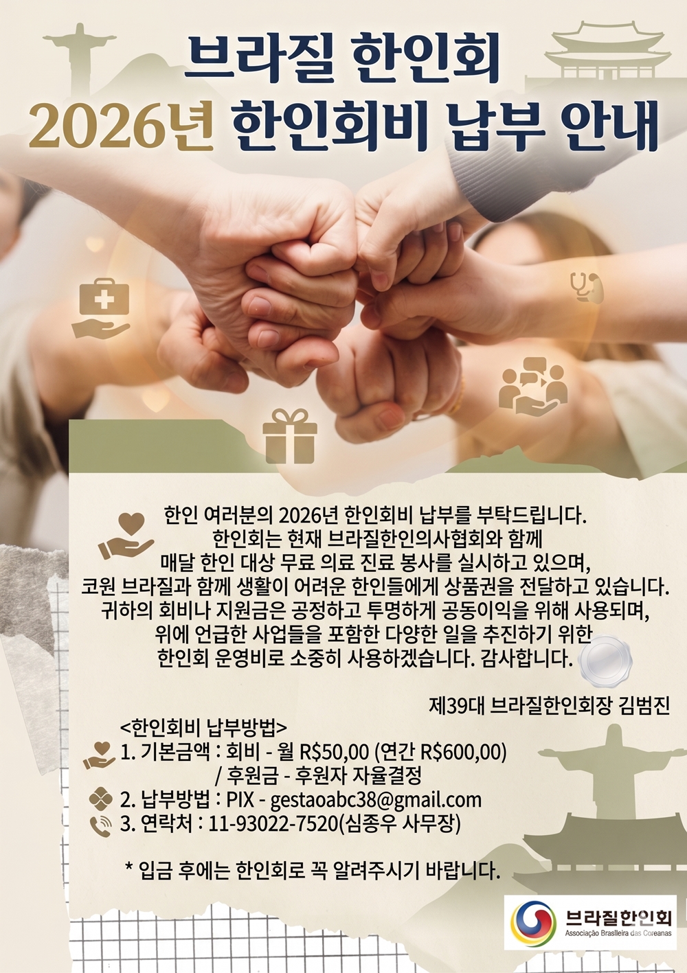이에 노인회가 다시 한번 나섰다. 노인회는 한인타운발전회에 미 씨의 안타까운 상황을 전달하며 도움을 요청했다. 사연을 전해 들은 한 익명의 독지가가 브라질 한인회 명의로 항공료의 절반을 선뜻 쾌척했고, 뜻을 함께하는 여러 동포 단체장들이 십시일반 정성을 보태며 마침내 귀국 비용 전액이 마련됐다.